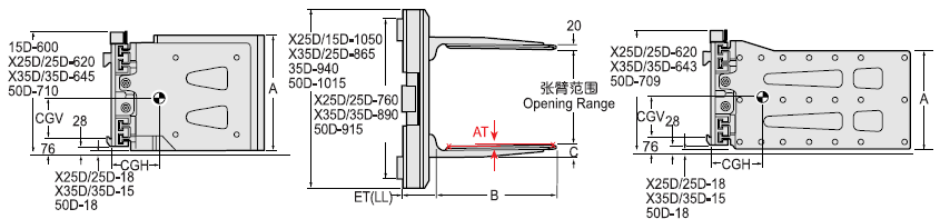 Capacity 承載能力(kg) | Catalog Order NO 型號 | Mounting Class 安裝等級 | Opening Range張臂范圍(mm) | Rad Height夾板高度A(mm) | Arm Length臂長B(mm) | Arm Thickness臂厚C(見注5)(mm) | Arm Toe in內扣量AT(見注6)(mm) | Vertcial Center Of Gravity垂直重心CGV(mm) | Weight 自重(kg) | Effective 失載距ET(mm) | Horizontal Center of Gravity 水平重心CGH(mm) |